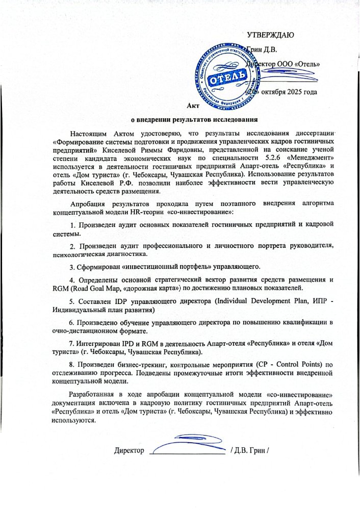 В рамках защиты кандидатской диссертации на тему "Формирование системы подготовки и продвижения управленческих кадров гостиничных предприятий" была внедрена концептуальная модель управления "со-инвестирование" в действующие гостиничные предприятия "Дом туриста" и "Республика".